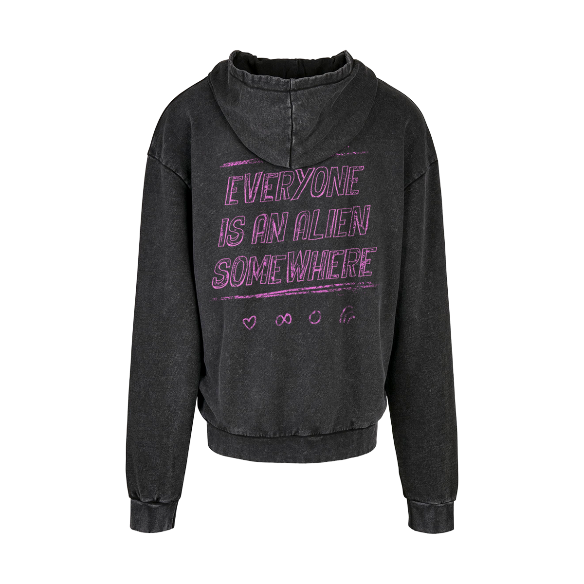 ALIEN RADIO PRINTED ON THE FRONT AND BACK OF A VINTAGE WASHED, 100% COTTON ADULT UNISEX HOODIE. EVERYONE IS AN ALIEN SOMEWHERE PRINTED ON THE BACK.